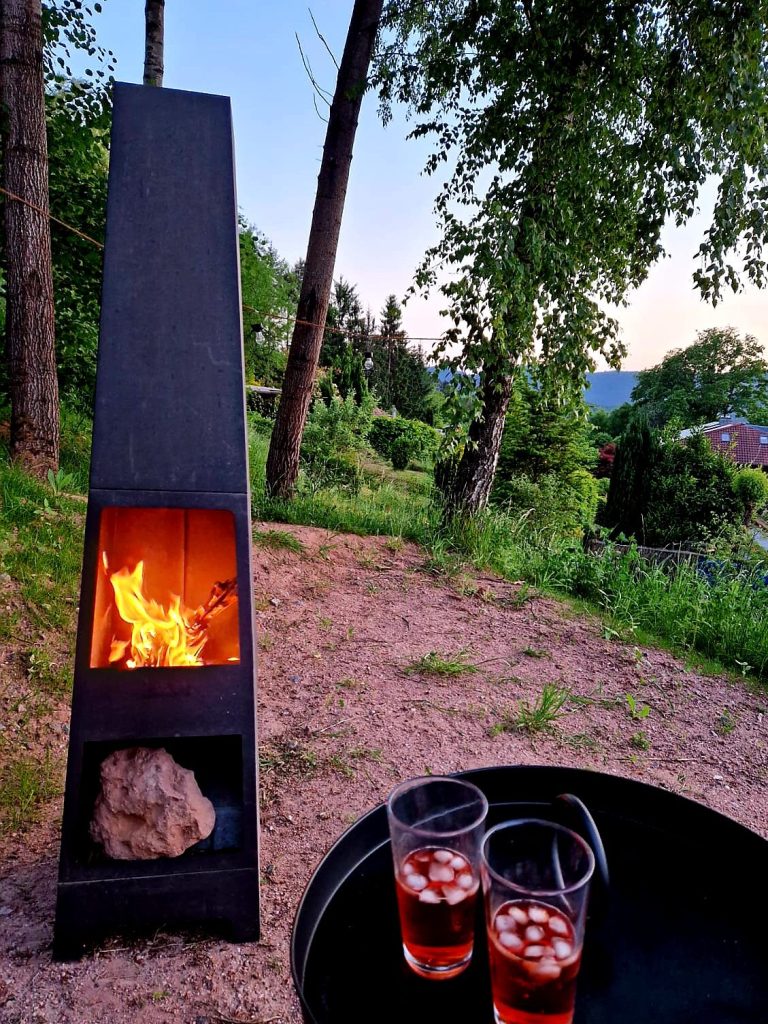 Umgeben ist die Rausblick Cabin von einem großen Naturgarten. Naschen Sie gern im Spätsommer von den Heidelbeerbüschen oder sitzen Sie gemütlich am Feuerkamin unter Birken und Pappeln. Von Juni bis August erleuchten hunderte Glühwürmchen den Garten mit ihren zauberhaften Feenlichtern. Und der Ausblick auf den Pfälzerwald ist auch hier spektakulär.